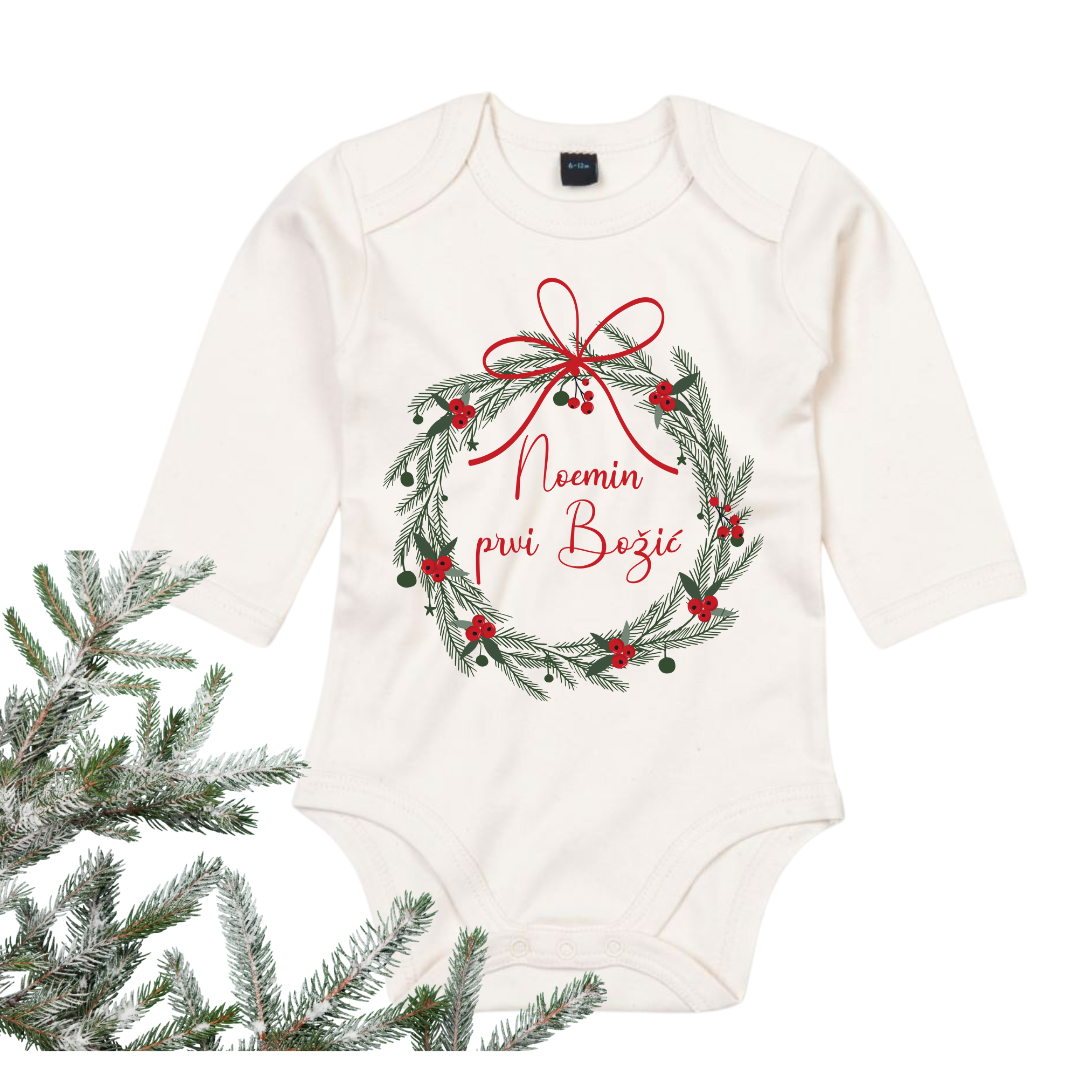 Naš bodi za bebe s natpisom “Moj Prvi Božić” predstavlja poseban i simboličan način za obilježavanje ovog čarobnog blagdana. Osim toga, svaki bodi može biti personaliziran dodavanjem imena vaše bebe, čineći ga jedinstvenim i posebnim.