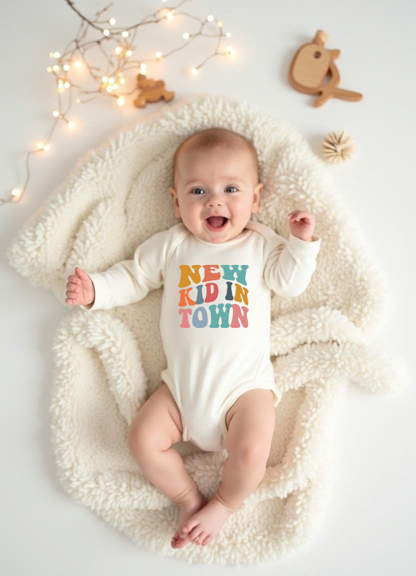 Ovaj preslatki baby body s natpisom “New Kid in Town” savršen je za najmlađe članove obitelji. Izrađen je od 100% organskog pamuka, koji je izuzetno mekan i nježan prema osjetljivoj koži beba, pružajući maksimalnu udobnost tijekom cijelog dana. Body dolazi u klasičnoj bijeloj boji, što ga čini jednostavnim za kombiniranje s drugim komadima odjeće.
