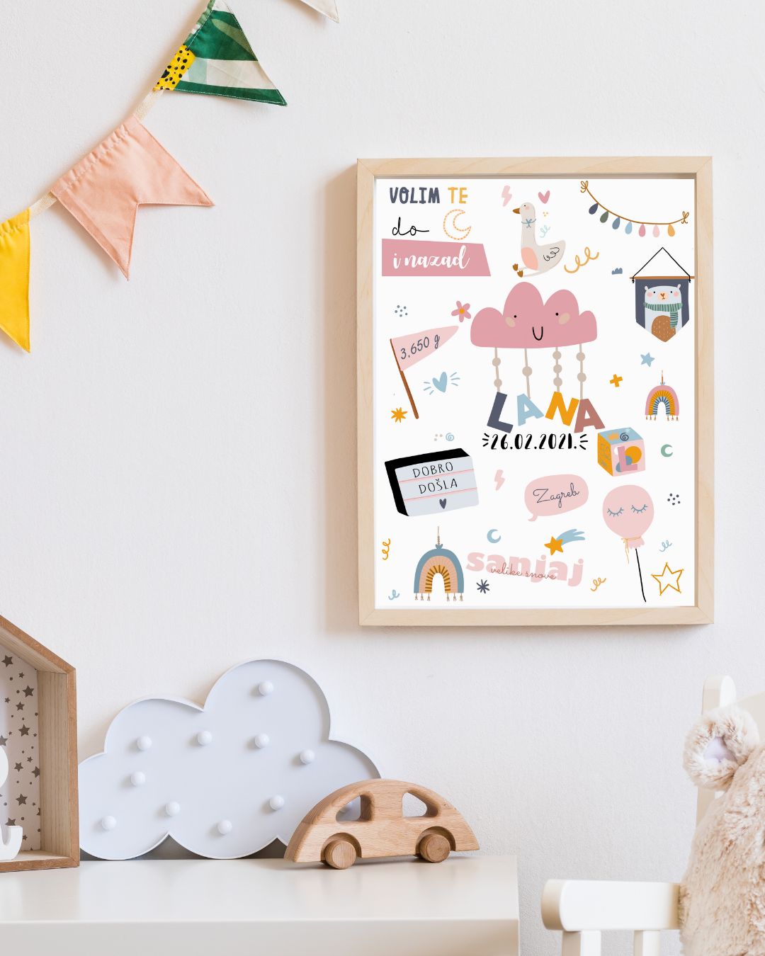Personalizirani poster s imenom djeteta, datumom i mjestom rođenja, težinom i dužinom. Jedinstven i emotivan poklon za novopečene roditelje te trajna uspomena koja krasi svaki dom s ljubavlju.